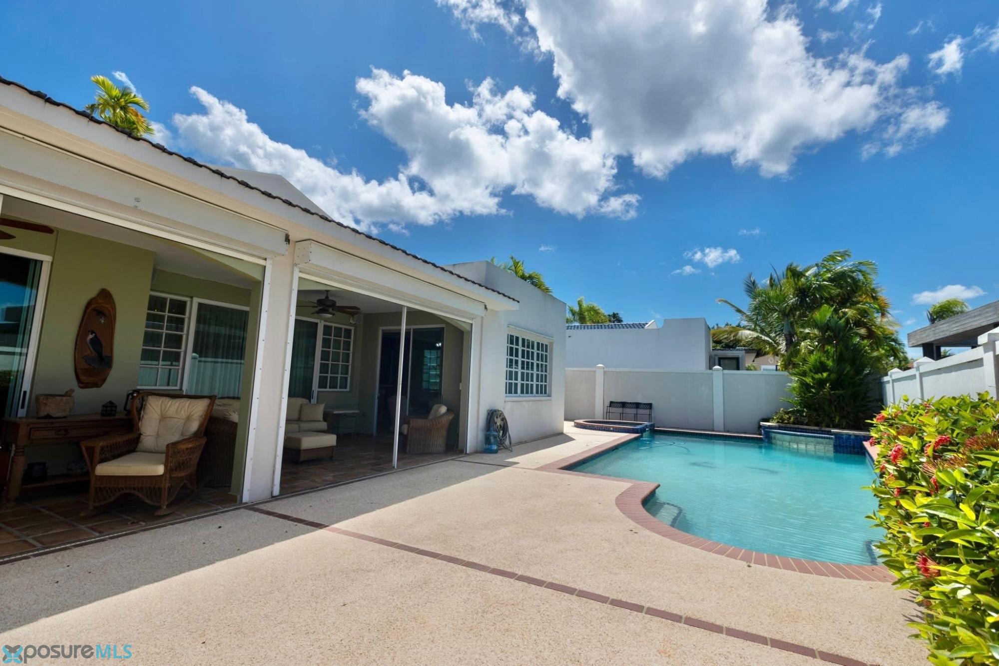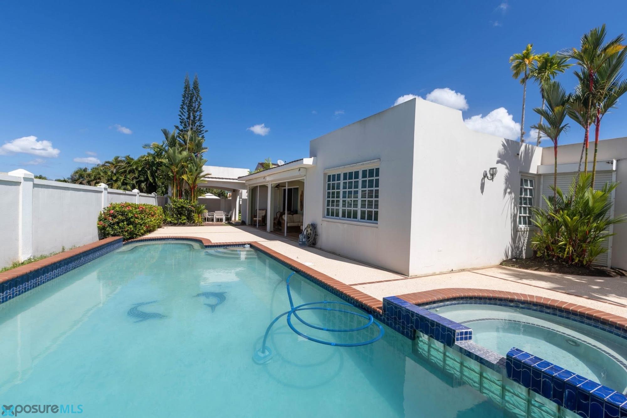 This elegant residence, located in the exclusive Montehiedra community on Falcón Street in San Juan, corresponds to Model H, the largest single-story the community. It features 4 spacious bedrooms and 3.5 bathrooms. The primary bedroom offers a comfortable walk-in closet. Outdoors, you can enjoy a beautiful pool with jacuzzi and a terrace area, ideal for entertaining and family enjoyment. Additionally, the property is equipped with electric storm shutters and a gas-powered generator, providing added security and peace of mind. It sits on an approximately 779 square meter lot and offers about 3,015 square feet of construction. The community offers excellent amenities, including a gym, swimming pool, basketball and tennis courts, a passive park, recreational areas, and 24/7 security with controlled access. HOA fee: $345/month..